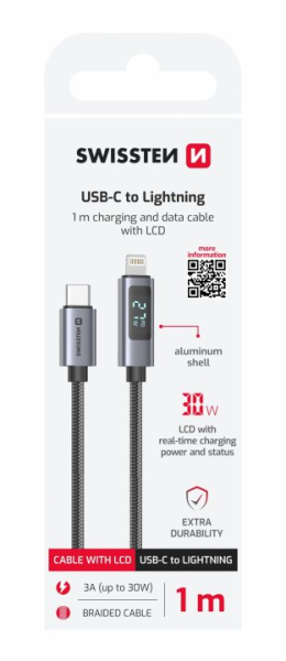 SWISSTEN LCD kabel USB-C / Lightning 1 m přináší revoluční způsob, jak mít neustálý přehled o průběhu nabíjení vašeho zařízení. Díky integrovanému LCD displeji okamžitě vidíte aktuální výkon ve wattech a indikaci technologie Power Delivery, což vám umožní efektivně kontrolovat rychlost nabíjení.